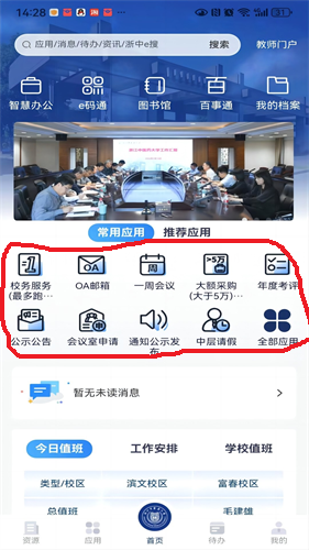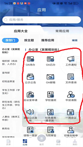 3、在应用页面,看到诸多部门的应用功能,根据根据需求点击使用