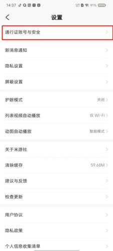 1、点击右下角【我的】,在我的界面点击右上角的【设置】,在新页面中选择点击通行证账号与安全。