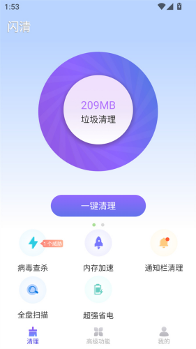 1、下载并安装好闪清app,打开app进入到”清理“,用户可以根据自身需求选择相应功能。