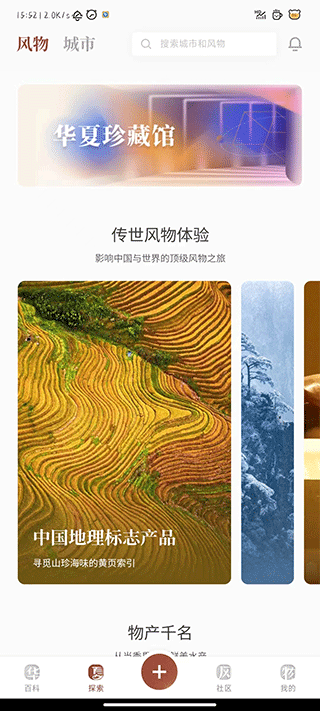 2、探索界面中分为两大板块,风物可以看到中国地理标志产品、世界遗产在中国、国之重宝等,体验传世风物,城市则可以标记和分享你的家乡,或者找寻具体地理位置的风物
