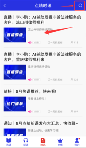 3、进入时讯板块可搜索或浏览法律直播预告与专业资讯动态。