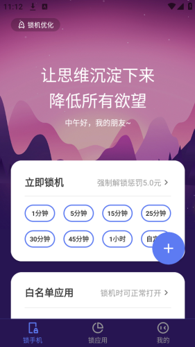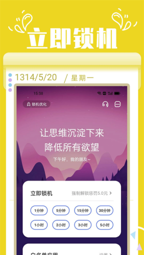 4、一键锁机:一键锁机,快速进入工作/学习状态,摆脱手机干扰不做手机控,不做低头族。