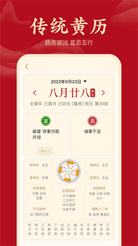 提供传统的老黄历查询,提供择吉日待功能,可查询当日宜忌、时辰宜忌等等,是您为嫁娶、乔迁、开业等重大节日选择吉祥日子的好帮手。