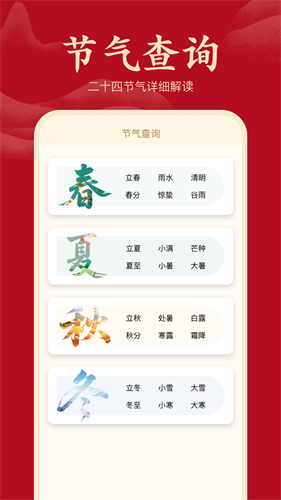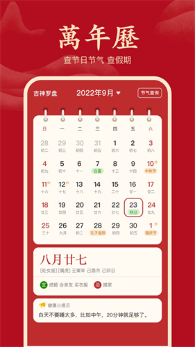 3、经典万年历界面,支持公历与农历转换,方便您查看二十四节气、重要节日、传统节日等等。