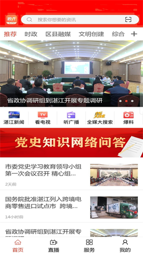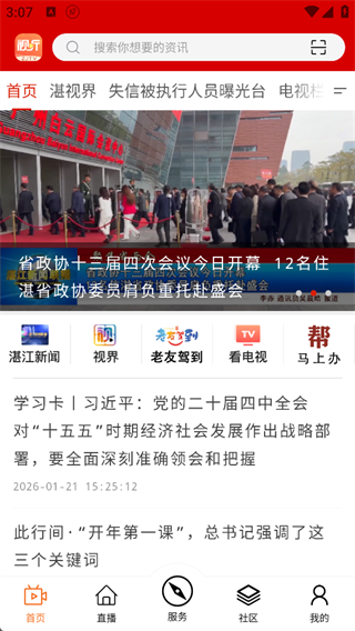 首页汇聚湛江本地时政、民生等核心资讯,可快速浏览省政协会议等本地热点新闻。