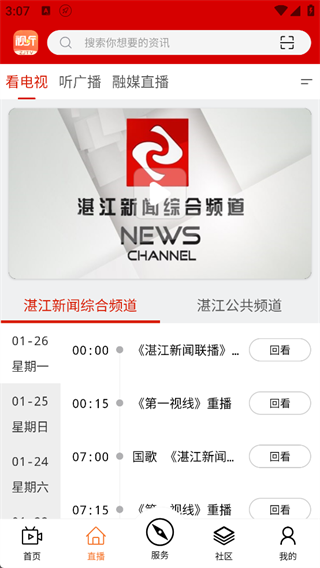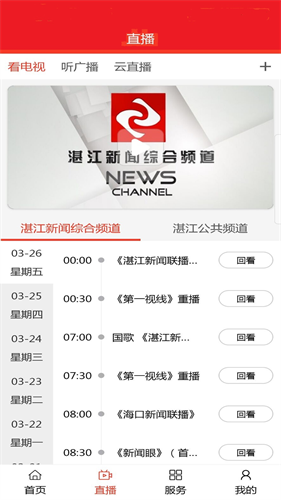 直播可实时收看湛江新闻综合频道、公共频道,还能回看节目。