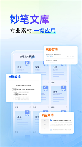 2、范文搜索、素材搜索、法定公文模板和规范应用模板组成的文库,满足多样化需求。