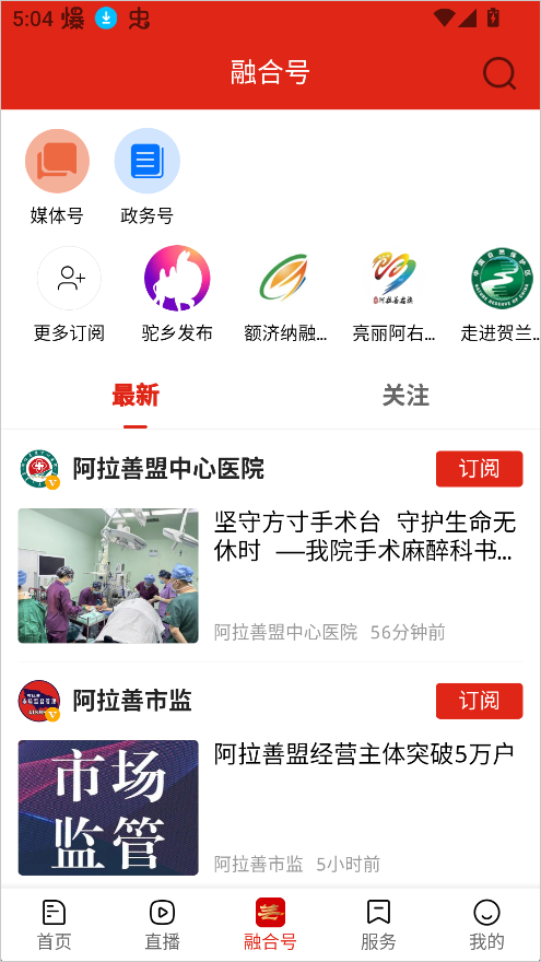 阿拉善融媒的特色订阅平台,用户可以根据兴趣选择关注不同领域的官方账号,如民生服务、文化旅游、教育健康等。
