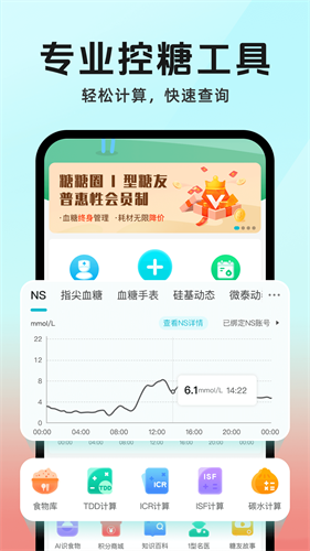 1、免费自我管理工具:如全面血糖记录、AI碳水识别、食物库快速查碳水、智能血糖日历、糖化预测、多维度血糖分析、血糖报告导出、电子病例导出等,功能丰富齐全,满足1型糖友日常所需。