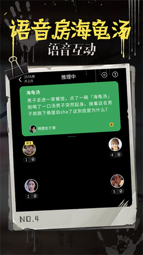 1、经典海龟汤模式:房主发布汤面后玩家通过是/否问答逐步推理,限时30分钟揭晓真相。