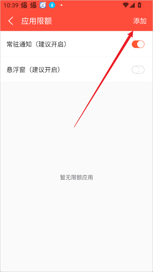 2、在应用限额界面中,点击右上角的添加按钮。