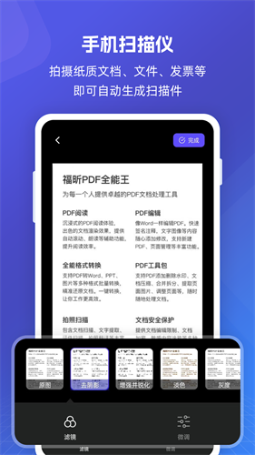 福昕PDF全能王app是一款全能办公神器,它集编辑、转换、扫描、注释、合并拆分、OCR识别、翻译、加密等数十项核心功能于一身,几乎覆盖职场人士与学生日常处理文档的所有场景,无论是修改合同文字、将纸质文件拍照转为高清PDF,还是把多页扫描件合并成一份报告,操作都流畅直观。在面对堆积如山的纸质材料,只需打开手机摄像头,福昕PDF全能王app便能自动校正角度、增强对比,生成可搜索的PDF或JPEG文件,需要协作时,多份资料可快速合并,重要页面也能单独拆出分享。特别值得一提的是其多语言OCR与翻译联动功能,外文合同、学术论文中的关键段落,拍一下就能译成中文并复制使用。从学生整理笔记到商务人士签署文件,它用极简交互承载专业级生产力,让繁琐的文档工作变得轻盈从容。