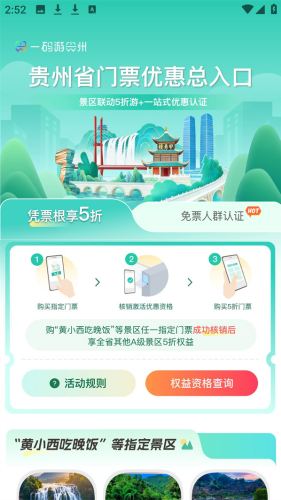 贵州一码游app官方版是一款贵州旅游移动服务平台,有了这款软件能够帮助用户在贵州的旅行更加轻松,用户可以使用软件查看旅游攻略、购买门票、机票、导游预约、特产购买,软件的功能强大,涵盖了衣食住行玩各个方面,用户使用软件进行购票还会有优惠,软件中所有的商家都是经过严格审核的。根据软件提供的各种旅游攻略,让用户制定最合适自己的旅游路线、旅游玩法,让你在贵州的旅游更舒适,需要的用户快来下载吧,还有许多的内容等你来浏览。