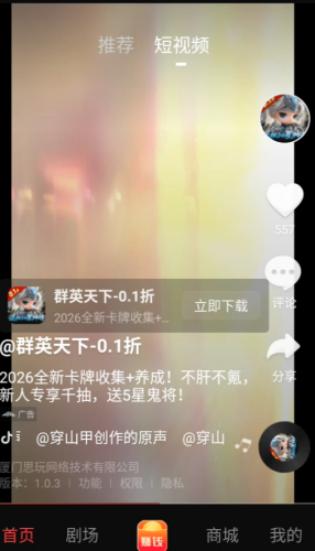 3、首页采用刷短视频模式,上下滑动短视频,不喜欢直接下一个。