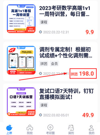 1、在小白考研课程的介绍界面中选择带有拼团字样的课程。
