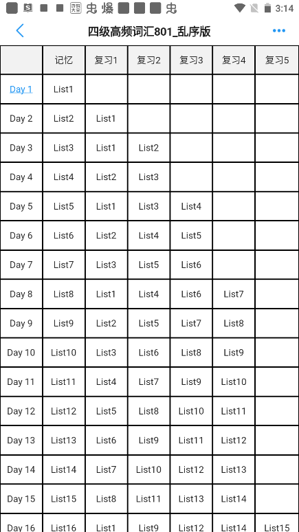 通过调整List总数,把单词词库进行平分,得到平均词汇量和总天数,选择乱序或正序版本,由此得到一份学习计划表。