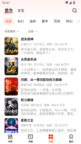 3、在分类界面下,我们可以自由切换男女频,可以筛选出各种玄幻、仙侠、都市等小说作品。