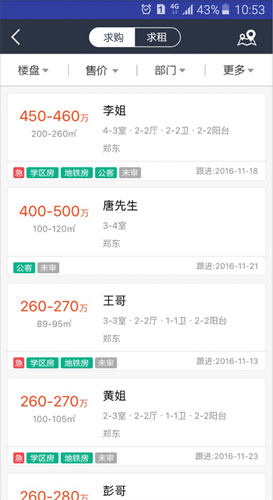 5、客户管理中心提供了丰富的需求资源,还将这些资源也做了求购与求租分类。
