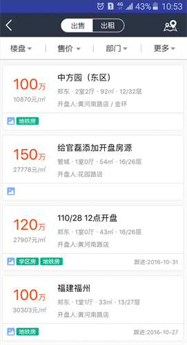 3、提供了两种形式的房源管理,区分了出售与出租的房源信息,能自由切换管理。