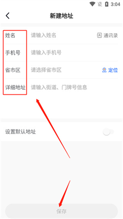 5、进入新建地址界面,输入姓名、手机号、省市区、详细地址,点击【保存】
