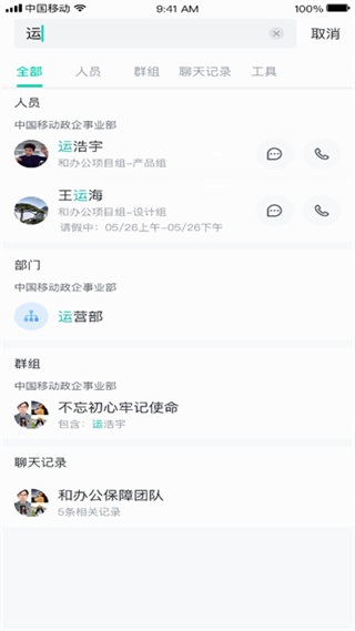1、知道姓名时,在顶栏“搜索”输入关键词或号码,可搜索到相关联系人、群聊、部门。