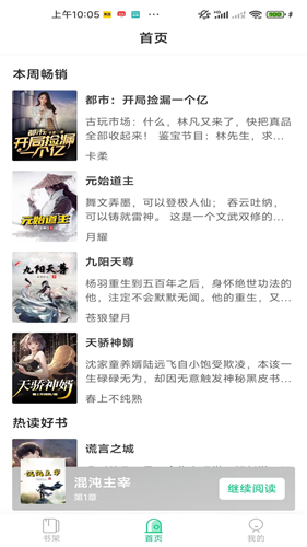 1、打开软件点击底部的首页可以看到本周畅销的小说内容