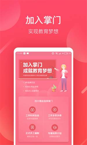 工作时间自由、工资多劳多、正式员工编制,还能定期晋升加薪。快来免费报名加入掌门讲师!报名后即可在掌门好老师App内随时查看入职进度哦。