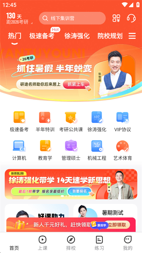 研途考研官网版是一款专为考研学子量身打造的全流程学习应用,它整合了院校择校、公共课精讲、专业课辅导与个性化规划于一体,依托研途教育多年教学积淀,汇聚张雪峰、徐涛、唐迟、杨超等一线名师资源,提供覆盖政治、英语、数学及各类专业课的高清直播与精品录播课程,支持免费试听与实时互动,确保学习过程既系统又灵活。研途考研官网版不仅提供由张雪峰领衔的名师团队主讲的高质量课程,还构建了集刷题、答疑、资讯与规划于一体的完整生态,用户可在通勤路上观看唐迟的阅读技巧精讲,午休时刷几组杨超精选的数学真题,晚上再根据系统推荐调整明日学习任务。研途考研官网版的题库涵盖公共课与主流专业课,试题均附详细解析;学习计划支持按天拆解目标,避免盲目推进,对于希望用碎片时间高效备考的人来说,这款App如同随身携带的考研自习室。
