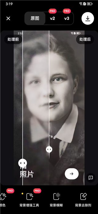 2、智能老照片修复引擎,可清除划痕/噪点/褪色,40年泛黄相片一键还原高清人像。