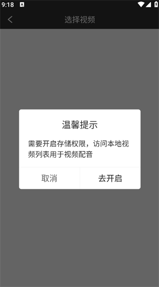 2、在您选择视频配音功能时,系统会弹出存储权限请求窗口,提示您开启权限以访问本地视频。