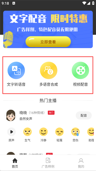 1、进入视频配音App首页,您将看到文字转语音、多语音合成和视频配音三大核心功能,同时也有热门主播的配音选项供您选择。