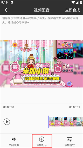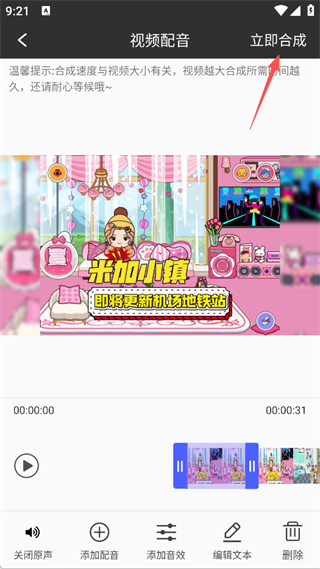 6、音频合成完成后,您将返回到视频配音界面,系统会提示您点击右上角的“立即合成”按钮,导出带有配音的最终视频。