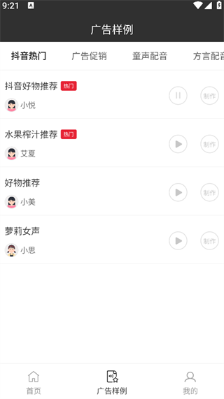 7、除了自定义配音外,视频配音App还提供丰富的广告模板,包括抖音热门、广告促销等分类模板,您可以直接试听或制作,满足各种广告创作需求。