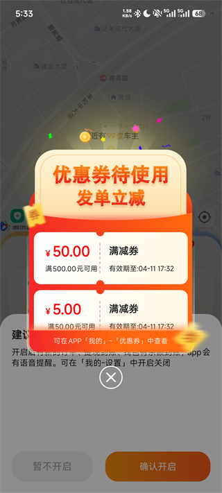 1、新用户首次登录即可获得优惠券,适用于打车服务,且有,有效期,记得使用哦。