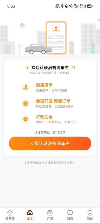 6、在车主认证引导页,了解顺风车的接单优势,如顺路接单、全国范围订单和行程安全等。完成认证后,即可开始接单,享受更多机会。