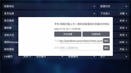2、接着点击主页的【设置】,找到【配置地址】,自定义输入点播源。