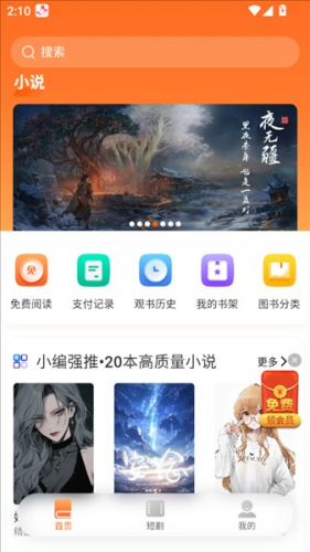 2、这样一来我们就正式来到了软件主界面,在这里拥有一目了然的内容,不仅汇聚了一系列最近热门畅销的小说作品而且还汇聚了免费阅读、支付记录、观书历史、我的书架、图书分类等等。