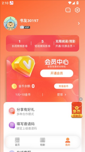 3、接着我们可以切换到我的界面下,在这里我们能够发现我们的账号拥有SVIP权限,这样一来就能够免费阅读一系列收费小说作品。此外,在这里还汇聚了分享有好礼、填写邀请码、我的订单、在线客服等一系列功能板块。