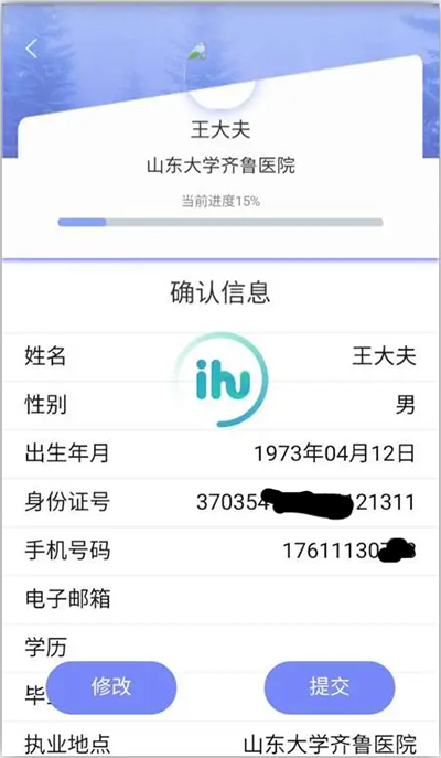 3、个人信息完善】 定考认证成功后,进入“医师确认信息”页面,逐项核实并完善后,选择“提交”,等待审核通知。