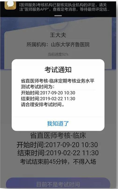 本轮定考结束后,医师将收到消息通知,可点击首页“定考”模块,查询考核结果。