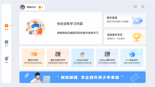 1、在软件首页,我们能够看到直播、图形化创作、图形化硬件创作、python创作等一系列板块。