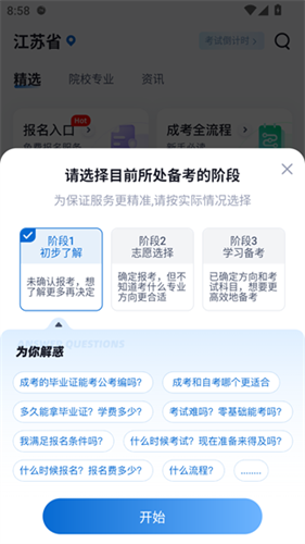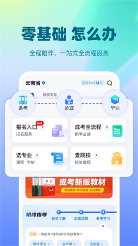 是你成考从报名咨询、备考、入学、毕业三年时间必不可少的成考工具,全程陪护,从备考阶段开始,院校专业选择、学习提升、应试技巧全程服务,到报考阶段的报名操作、准考证打印、考试提醒、成绩录取贴心指导。