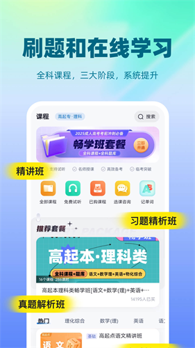 最新成考全科目全套课程,教材精讲、习题精析、真题解析、应试技巧,三大阶段四大班型,系统学习,逐步提升。