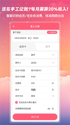 这里也可以让你轻松实现记账省钱,实时记录客户的消费账单,对其自动记录下来。