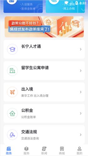 3、【政务】页面下可以为用户在线输求职、出入境、公积金、交规等事项。