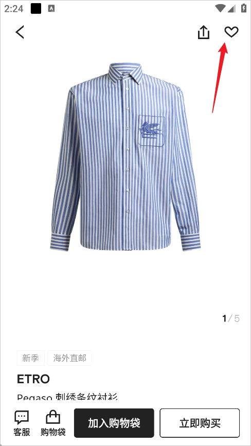 2、进入到商品详情页面,点击页面右上角的“心型”图标按钮;