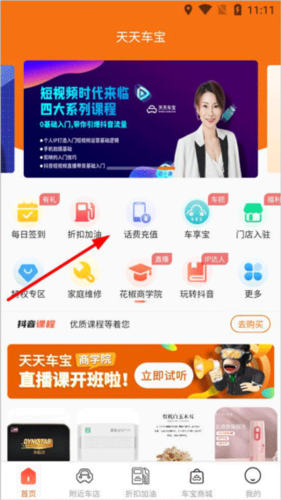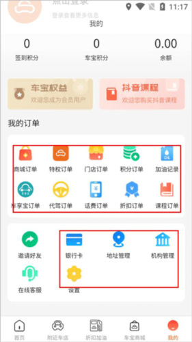 1、打开app,有首页、附近车店、折扣加油、车宝商城和我的版块,首页有基础功能;