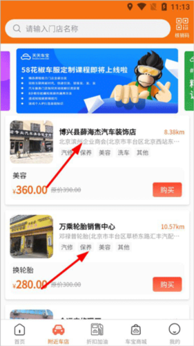 2、打开附近车店,可以查看附件的汽车美容店和汽配商店;