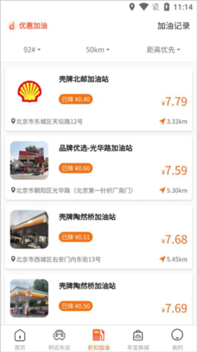 3、折扣加油页面,主要是50km内优惠加油的加油站地点和油价;