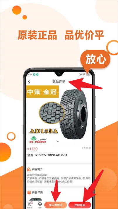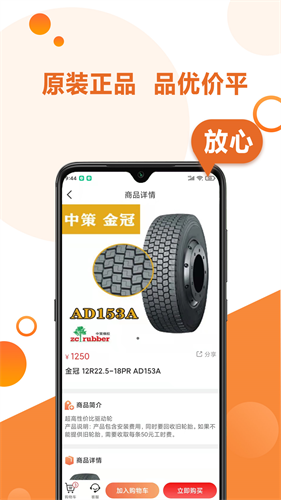 2、选中所需轮胎后可查看商品详情,点击“加入购物车”或“立即购买”快速下单。